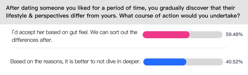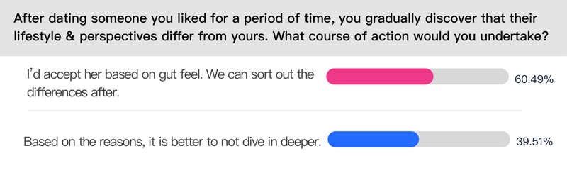 And that is probably why most of us chose to go with our gut feelings about someone we like, and choose to work things out slowly. This gut feeling doesn’t come often, does it? So, after dating someone you liked for a period of time, if you gradually discover that this person’s lifestyle and perspectives differ from yours, what will you choose to do?