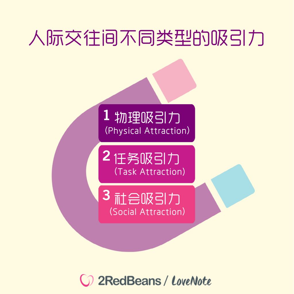 人际吸引理论告诉我们,人和人之间的吸引力分为三种类型,分别是:物理吸引力(Physical Attraction)、任务吸引力(Task Attraction)和社会吸引力(Social Attraction)。判断对对方是否有物理吸引几乎是瞬间的,其它两项则没有那么明显,需要通过一定程度和时间的交往,确定对方是积极的、明确的、有能力的,才会逐渐感知到对方是有吸引力的。