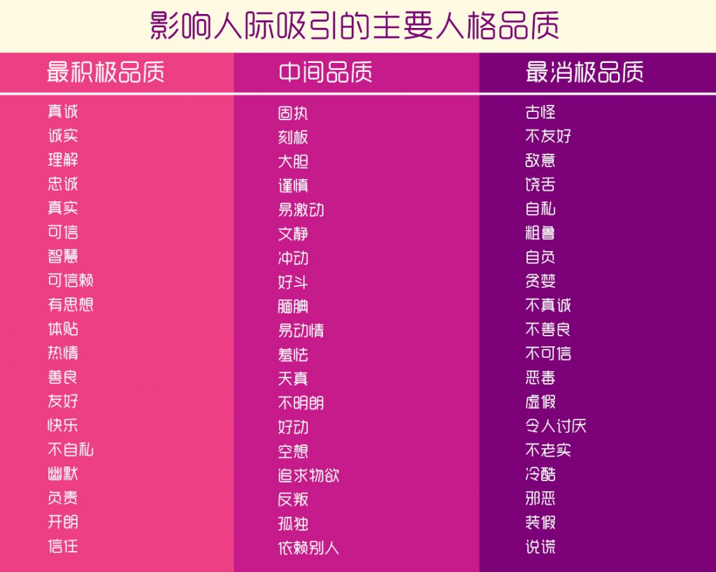 在社会吸引中,人格品质是体现个体吸引力最重要的因素之一。学者Anderson总结了影响人际吸引的主要人格品质,受欢迎程度最高的六项品质分别是:真诚、诚实、理解、忠诚、真实和可信,都和人的真诚度相关;而最不受欢迎的品质包括:说谎、装模作样和不真诚等。