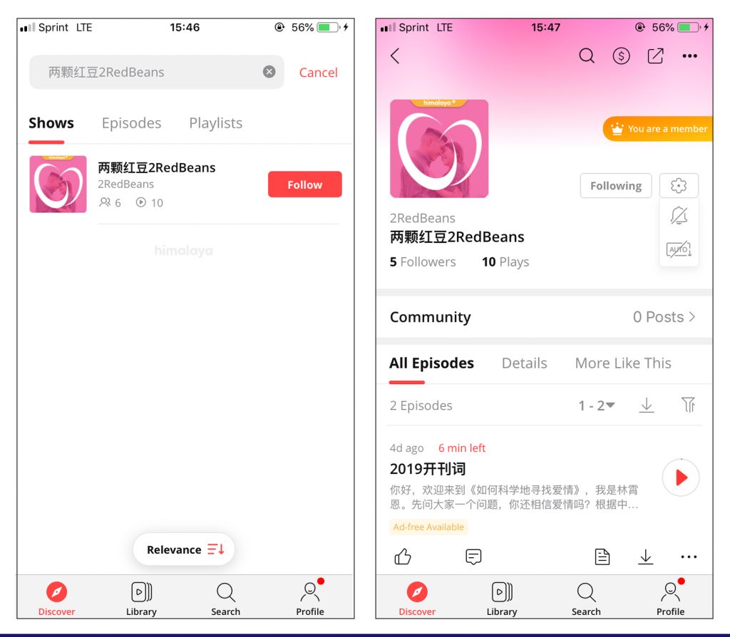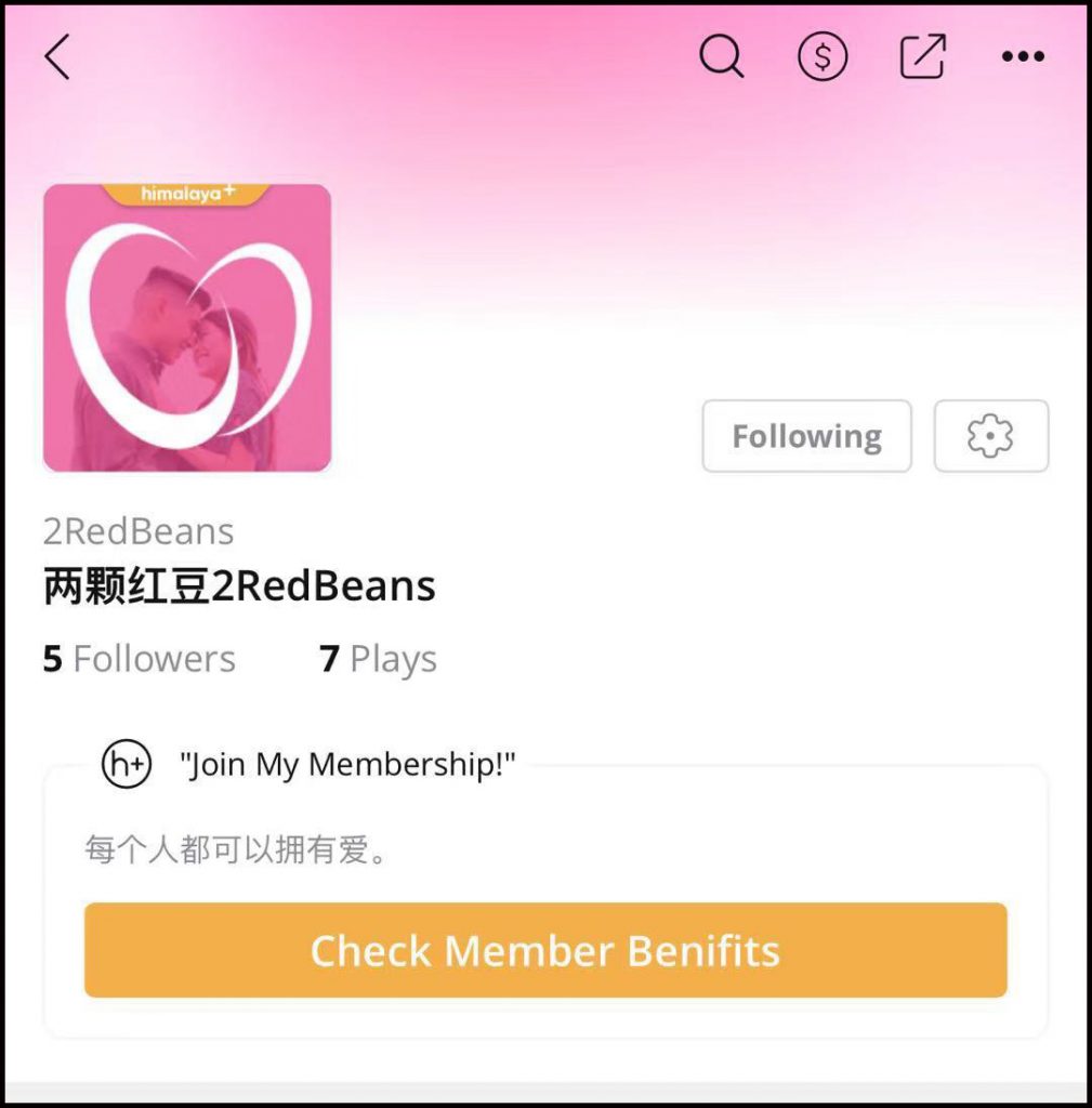 **两颗红豆正式入驻海外版喜马拉雅播客平台 —— Himalaya,并开通全新播客专辑。**自此,海外华人将在第一时间收听到量身定制的情感类音频课程,和婚恋顾问在线互动,并获取两颗红豆为Himalaya社群粉丝提供的专属优惠活动。