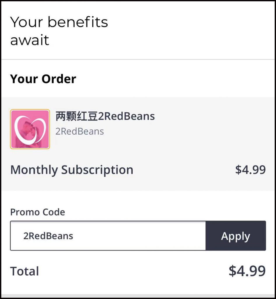 **3. 订阅时输入折扣码:2redbeans,你还将获得首月“免费订阅”。